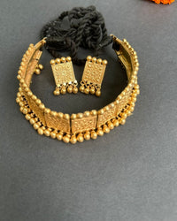 Weighing 132.32 grams, this set pairs a gold-polished floral chokar with matching earrings, perfect for weddings and special occasions.