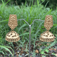 These gold-polished silver jaal jhumkas blend traditional artistry with modern elegance. Crafted from high-quality silver with a refined 22kt gold polish, their intricate jaal design showcases fine craftsmanship and offers lightweight comfort for all-day wear. Perfect for adding a touch of sophistication to ethnic and contemporary outfits alike, these jhumkas elevate any ensemble with timeless charm.