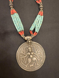 The Maa Kali Tribal Statement piece combines bold tribal artistry with vibrant turquoise and coral stones, creating a striking accessory that reflects cultural richness and timeless elegance. This carefully crafted design enhances your ensemble with a distinct ethnic charm, perfect for making a confident style statement. Ideal for those who appreciate expert craftsmanship and meaningful symbolism.