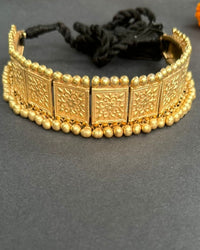 Weighing 116.97 grams, this chokar features floral designs in a radiant gold polish, offering richness and festive sophistication.